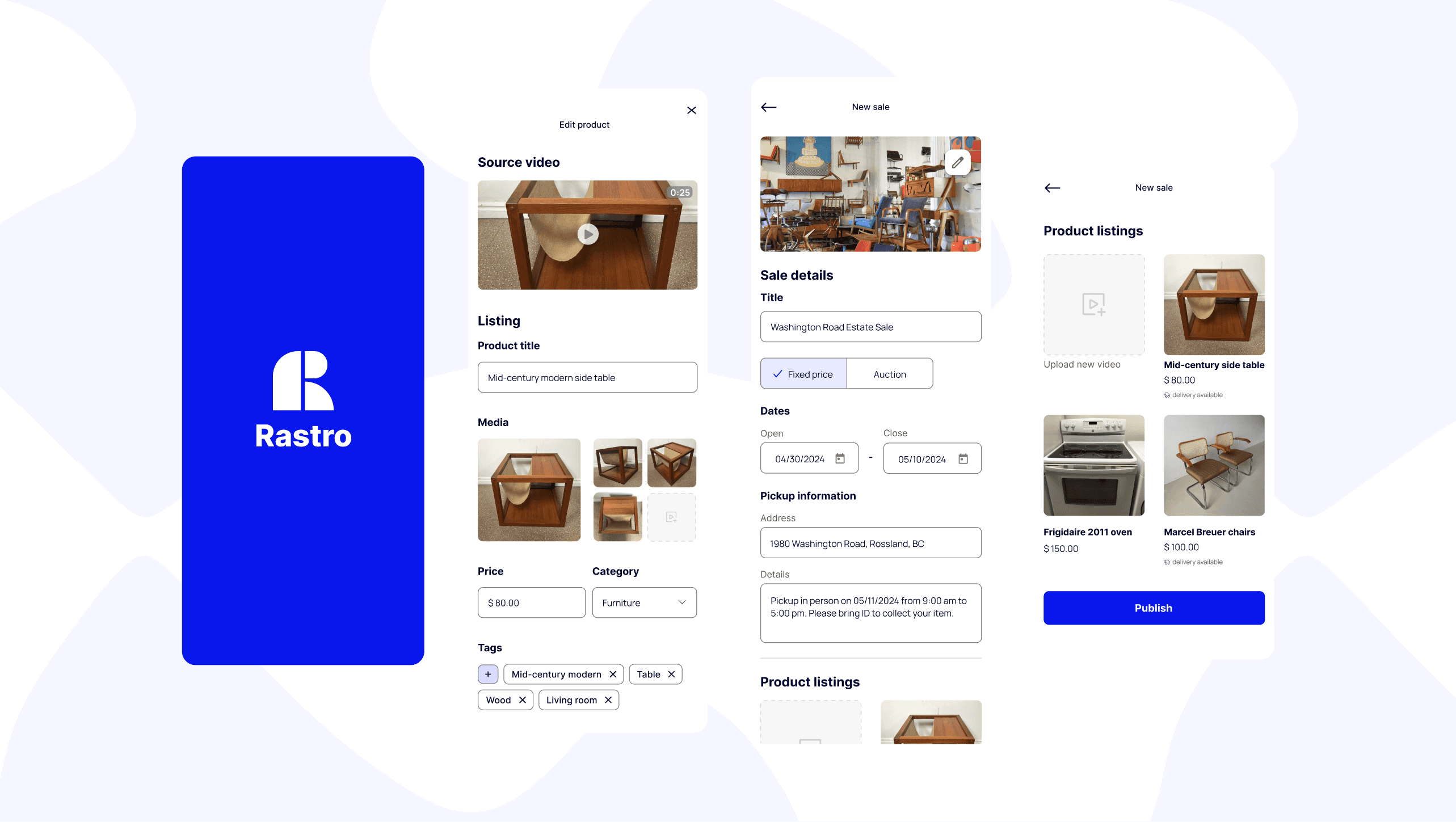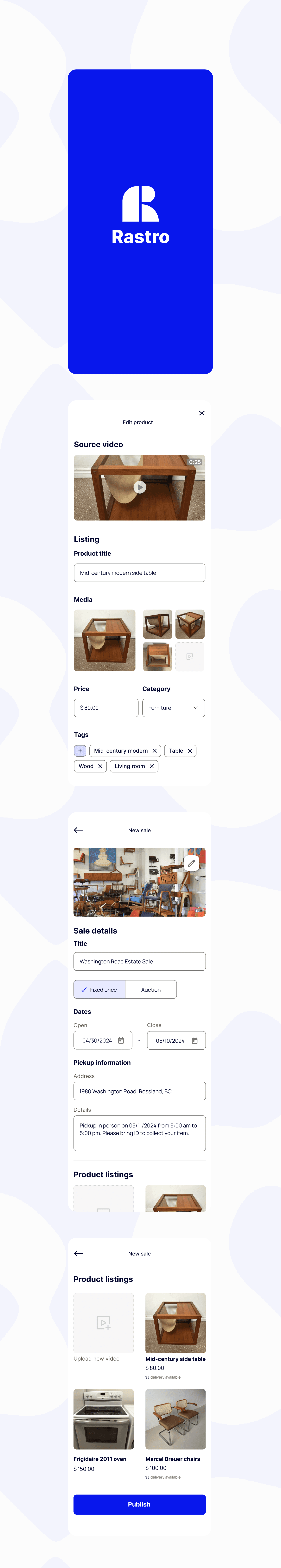 Rastro is a web app that simplifies selling secondhand goods through short descriptive videos. Using AI, it automatically generates product pages and allows quick sharing on selling platforms. I designed the proof of concept and branding for the founder to present to potential users and investors.