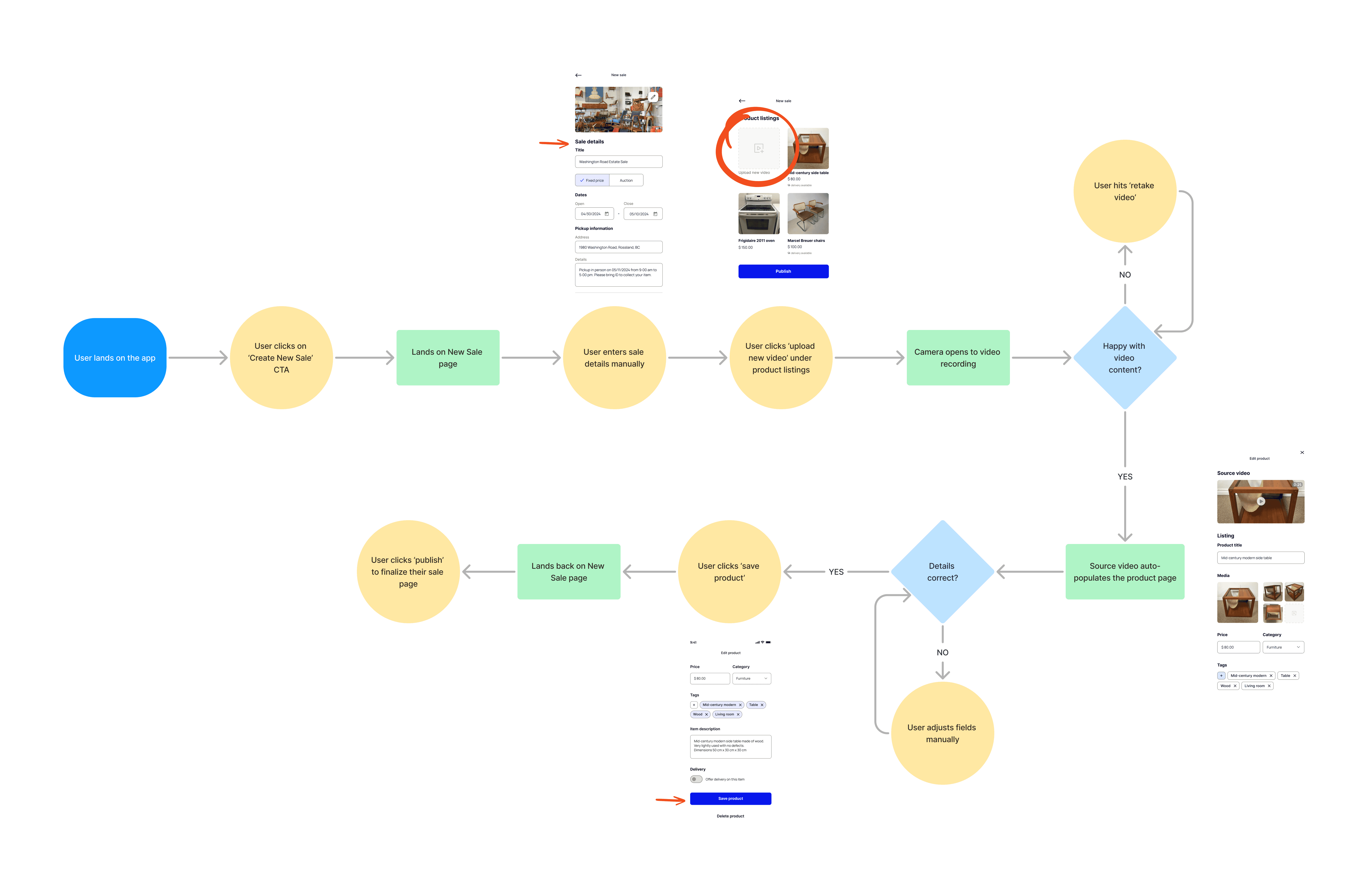 The goal was to design an experience that felt familiar and made AI easy and intuitive. I needed to meet the needs of experienced auction sellers, who rely on these platforms for their business, and casual users looking for a quick way to sell secondhand furniture. The solution had to blend usability with a modern feel. One way I approached this was by mapping out the user flow of the AI portion, ensuring it was as streamlined and intuitive as possible.